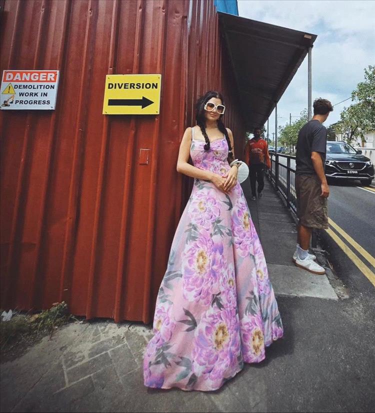 - ألوان متناغمة: يتم تنسيق الحذاء والحقيبة بألوان مستوحاة من نقشة الفستان، ما يخلق انسجاماً بصرياً أنيقاً.