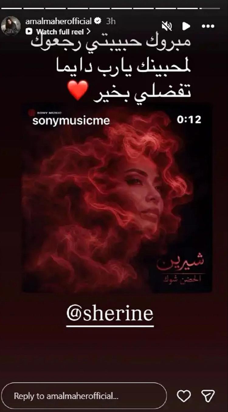 احتفلت الفنانة آمال ماهر، بعودة زميلتها الفنانة شيرين عبد الوهاب الى الساحة الغنائية من جديد، وذلط بعد ظرحها أغنيتها الأخيرة "الحضن شوك"، موجهة لها رسالة دعم مؤثرة، أعربت من خلالها عن سعادتها بعودة شيرين الى جمهورها.