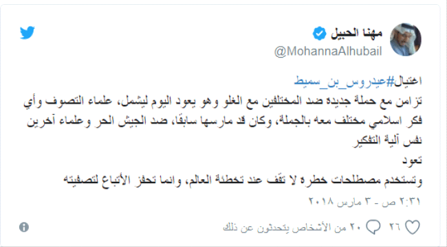 ومن خارج اليمن غرد الباحث مهنا الحبيل: “تزامن مع حملة جديدة ضد المختلفين مع الغلو وهو يعود اليوم ليشمل، علماء التصوف وأي فكر إسلامي مختلف معه بالجملة، وكان قد مارسها سابقًا، ضد الجيش الحر وعلماء آخرين