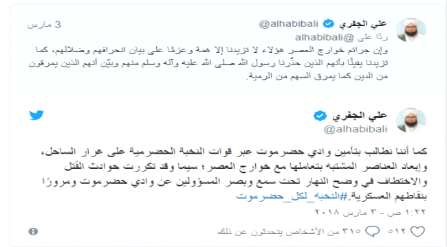 وأضاف الجفري: ” نطالب بتأمين وادي حضرموت عبر قوات النخبة الحضرمية على غرار الساحل، وإبعاد العناصر المشتبه بتعاملها مع خوارج العصر؛ سيما وقد تكررت حوادث القتل والاختطاف في وضح النهار تحت سمع وبصر المسؤولين عن وادي حضرموت ومرورًا بنقاطهم العسكرية.”