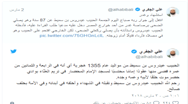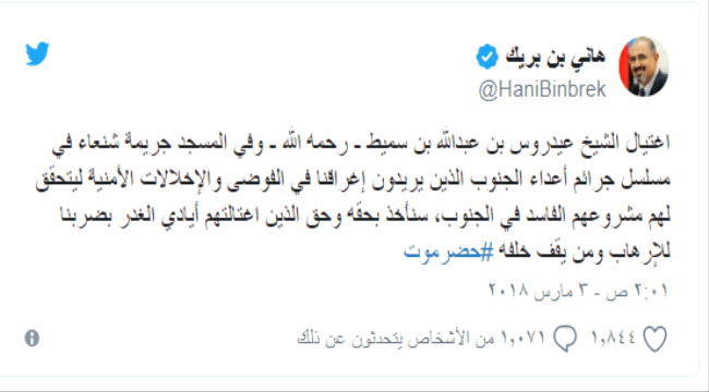 وغرد العضو القيادي بالمجلس الانتقالي الجنوبي هاني بريك: “اغتيال الشيخ عيدروس بن عبدالله بن سميط – رحمه الله – وفي المسجد جريمة شنعاء في مسلسل جرائم أعداء الجنوب الذين يريدون إغراقنا في الفوضى والإخلالات الأمنية ليتحقق لهم مشروعهم الفاسد في الجنوب، سنأخذ بحقه وحق الذين اغتالتهم أيادي الغدر بضربنا للإرهاب ومن يقف خلفه.”