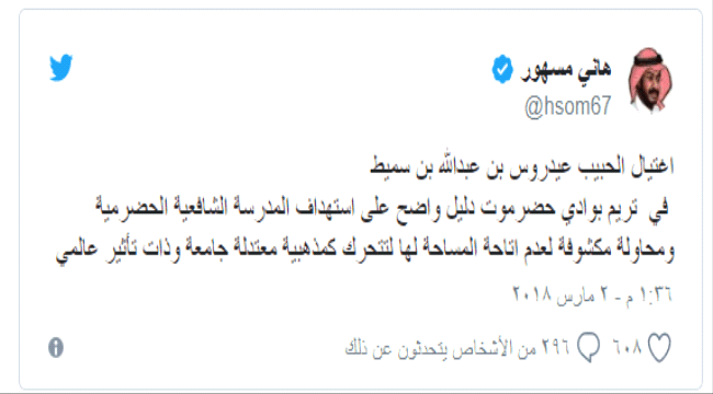 وعلق الكاتب اليمني هاني مسهور: “اغتيال الحبيب عيدروس بن عبدالله بن سميط في تريم بوادي حضرموت دليل واضح على استهداف المدرسة الشافعية الحضرمية ومحاولة مكشوفة لعدم إتاحة المساحة لها لتتحرك كمذهبية معتدلة جامعة وذات تأثير عالمي”.